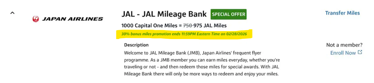 - With bonus: 1 Capital One Miles → 0.975 Japan Airlines miles